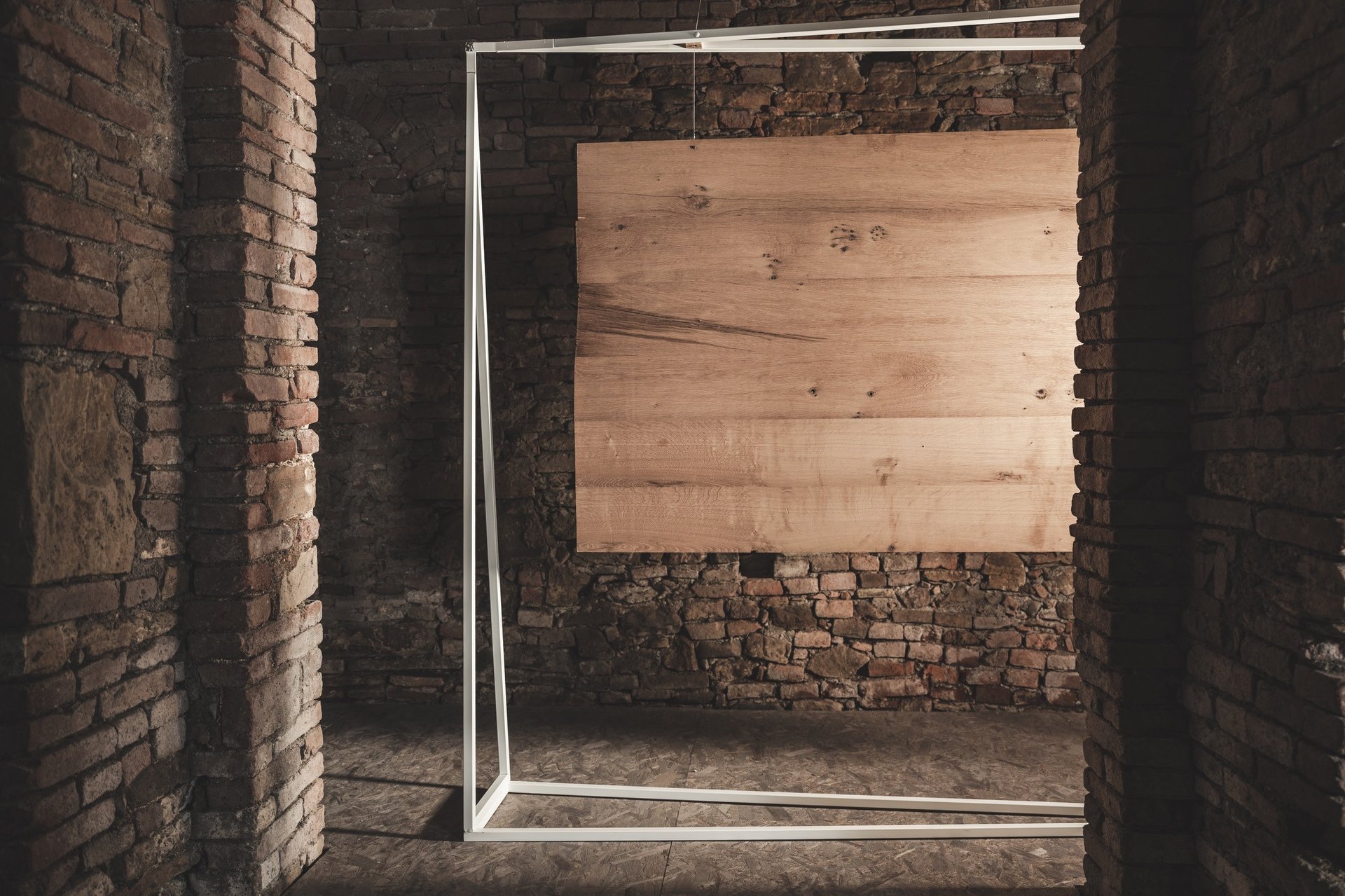 Tavola in legno massello di rovere, staffe e strutture autoportanti in acciaio